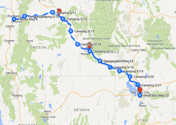 Map 3: May 9 – May 23, Portland, Oregon to Salt Lake City, Utah